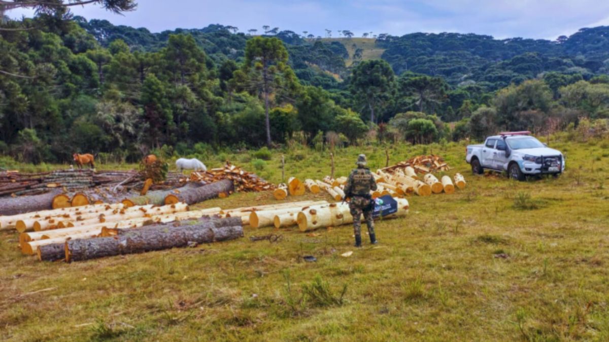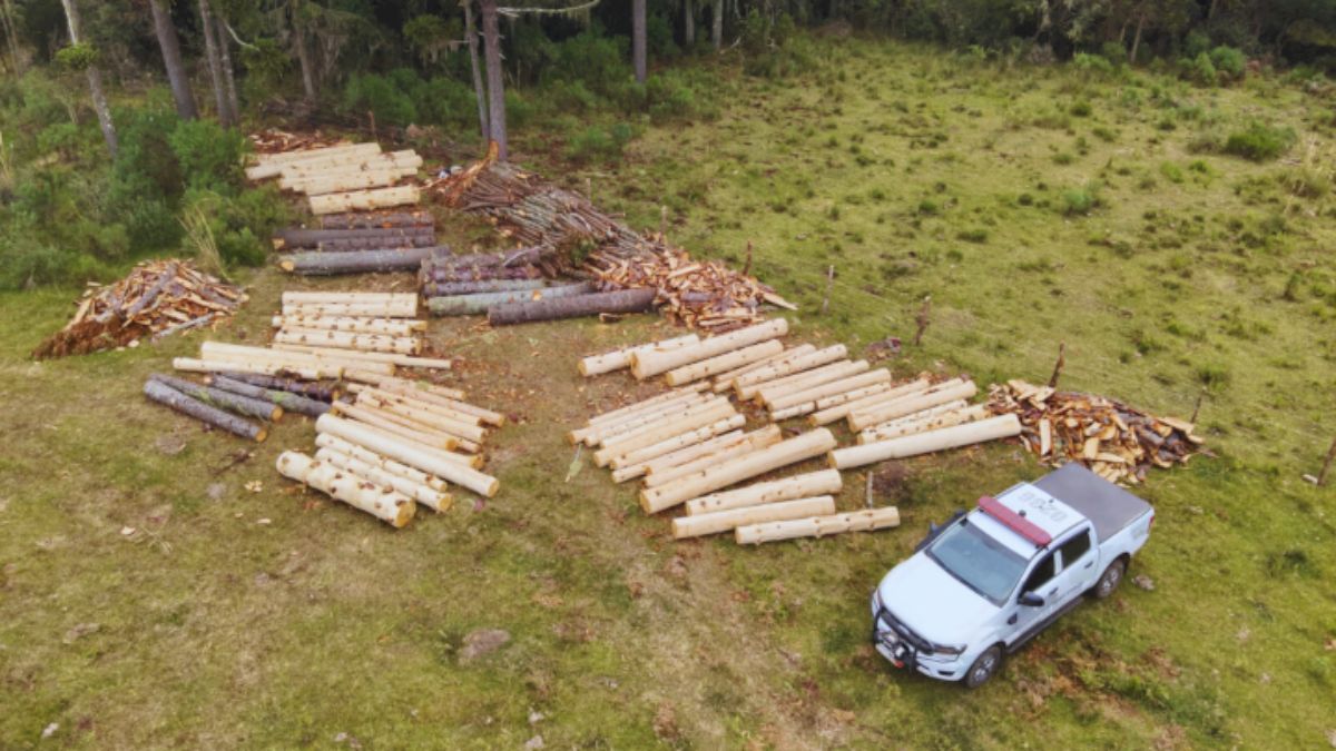 Durante patrulhamento ambiental, os policiais identificaram o corte ilegal de 91 árvores da espécie Araucária angustifolia, conhecida como Pinheiro-brasileiro, que está atualmente na lista de espécies ameaçadas de extinção.