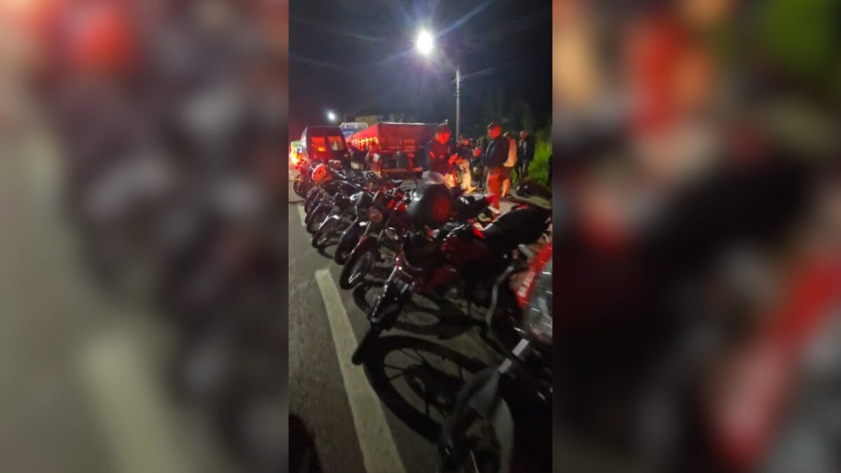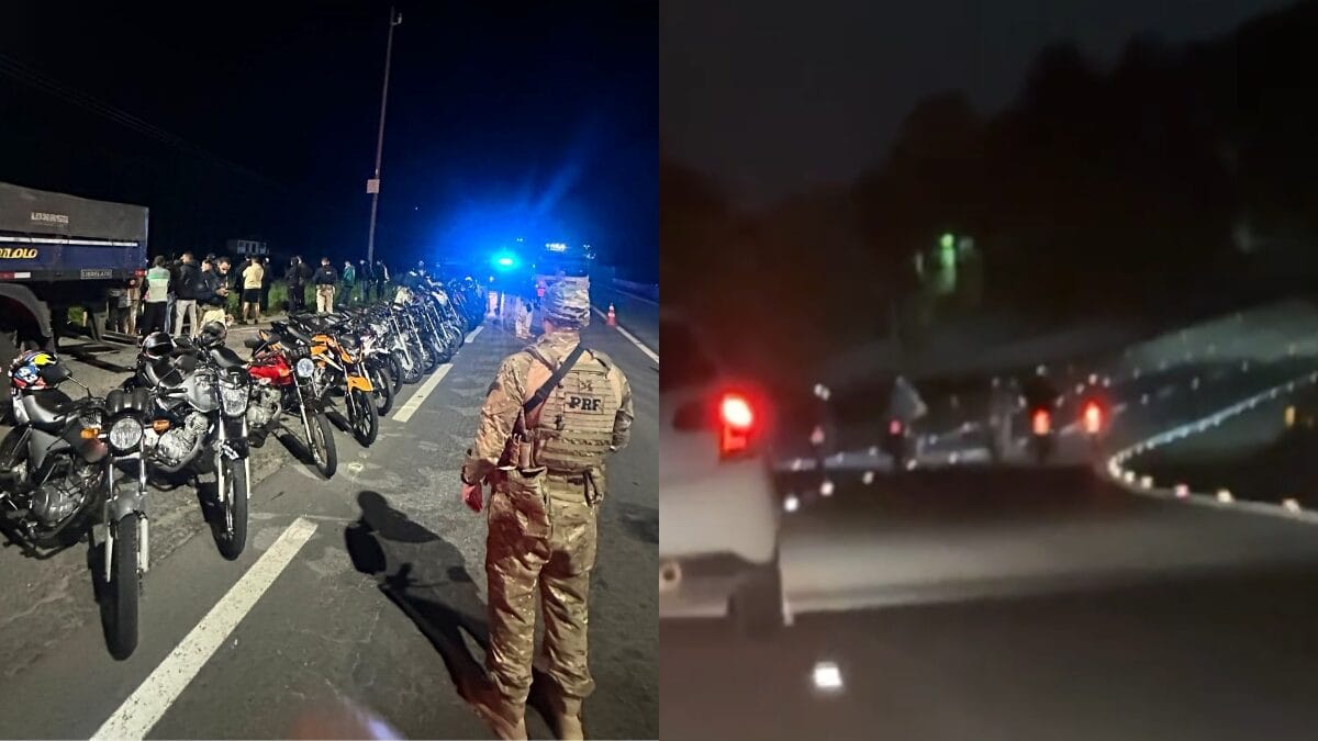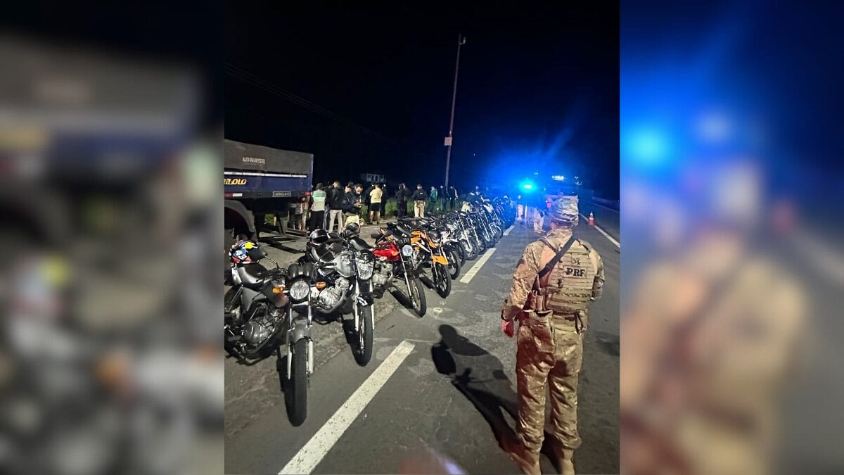Segundo a PRF, as equipes receberam informações de que os motociclistas circulavam em grande número, fazendo manobras arriscadas e empinando motos na rodovia. Diante da situação, os policiais montaram uma barreira em frente à unidade operacional da corporação para conter os envolvidos.