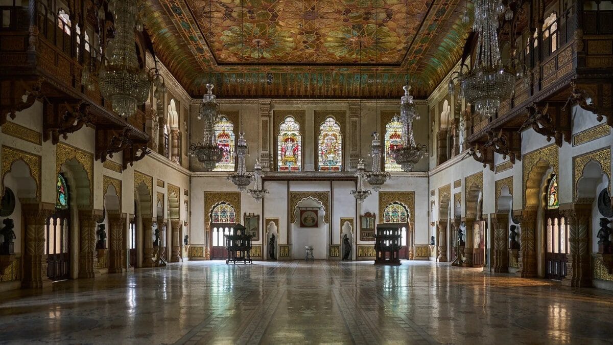 Outro destaque de tirar o fôlego é o salão Durbar, que impressiona com sua opulenta decoração e seus mosaicos venezianos. O ambiente exibe ainda vitrais belgas e detalhes do artesanato indiano. Os vitrais no fundo da sala, por exemplo, apresentam representações de divindades hindus, como Rama e Sita, além de Bala Krishna.