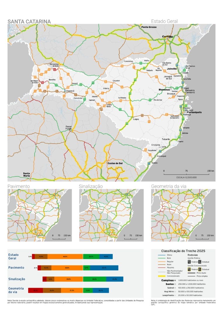O desempenho de Santa Catarina segue a tendência observada no restante do país. De acordo com a CNT, 62,1% da extensão total das rodovias brasileiras avaliadas em 2025 foram classificadas como regulares, ruins ou péssimas, enquanto apenas 37,9% receberam conceito ótimo ou bom.