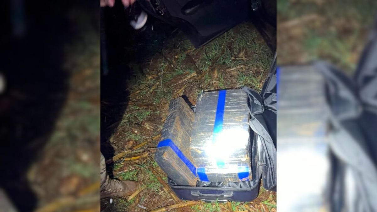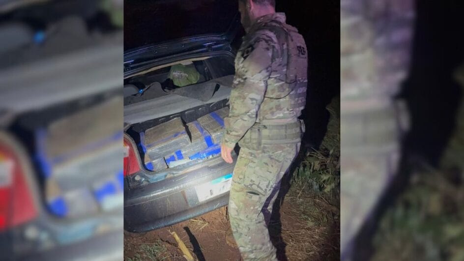 Os policiais deram ordem de parada, mas o motorista fugiu novamente. Depois de alguns minutos, ele saiu da rodovia, entrou em uma lavoura, abandonou o veículo e fugiu para a mata, não sendo mais localizado. No porta-malas e no banco traseiro, a equipe encontrou 201 quilos de maconha.