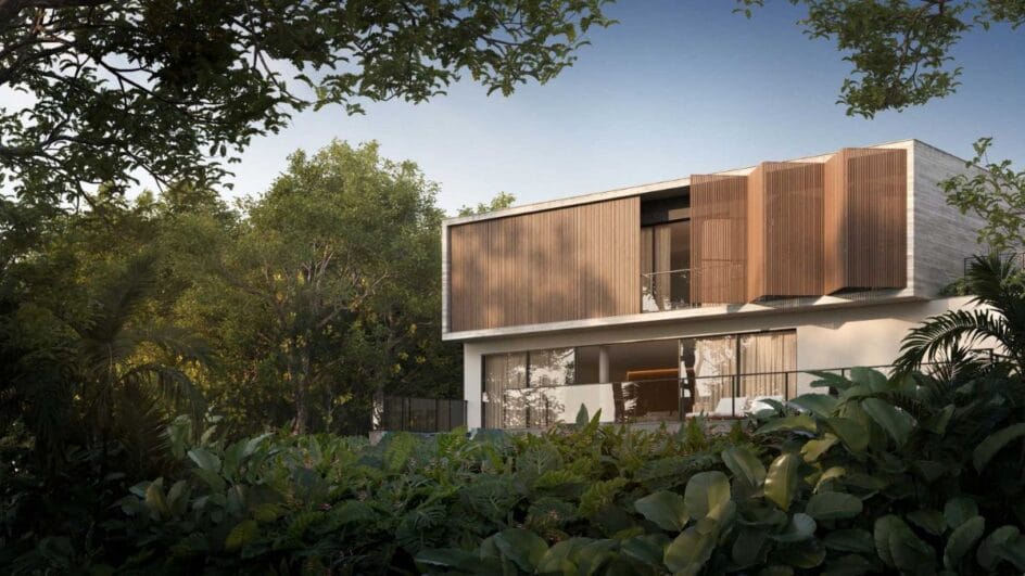 Já na planta mais espaçosa, de 589 metros quadrados, a área de living chega a ter 120 metros quadrados, enquanto a varanda tem 58 metros quadrados. Na área térrea, ainda há a cozinha, o pátio externo, a área de serviço, um banheiro e um quarto de serviço, lavabo, gabinete e, também, uma garagem para quatro veículos. Ambas as opções contam com piscina.