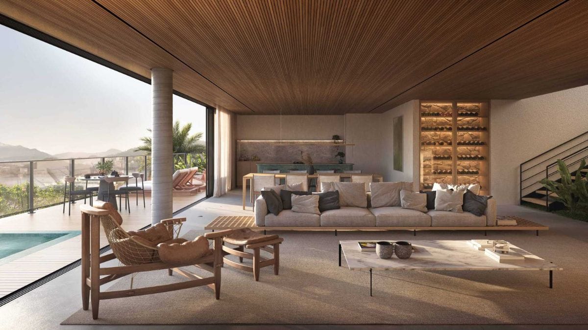 Na planta maior, a área de living pode alcançar 120 metros quadrados, com integração aos espaços externos. (Foto: Divulgação)