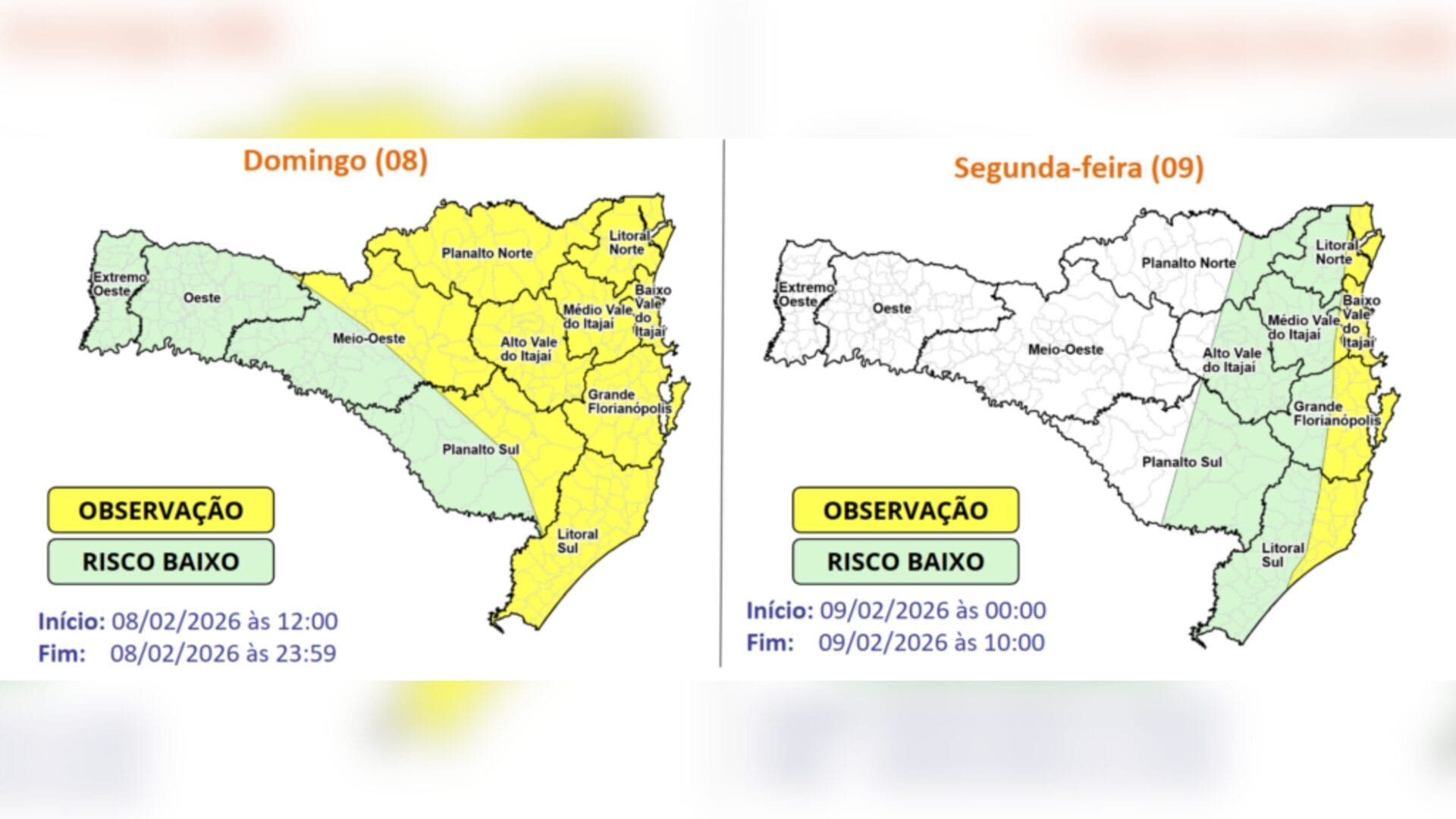 A Defesa Civil de Santa Catarina emitiu um alerta para a ocorrência de temporais isolados entre a tarde e a noite deste domingo (8) e para chuva persistente durante a madrugada e a manhã de segunda-feira (9). (veja abaixo as regiões em risco)