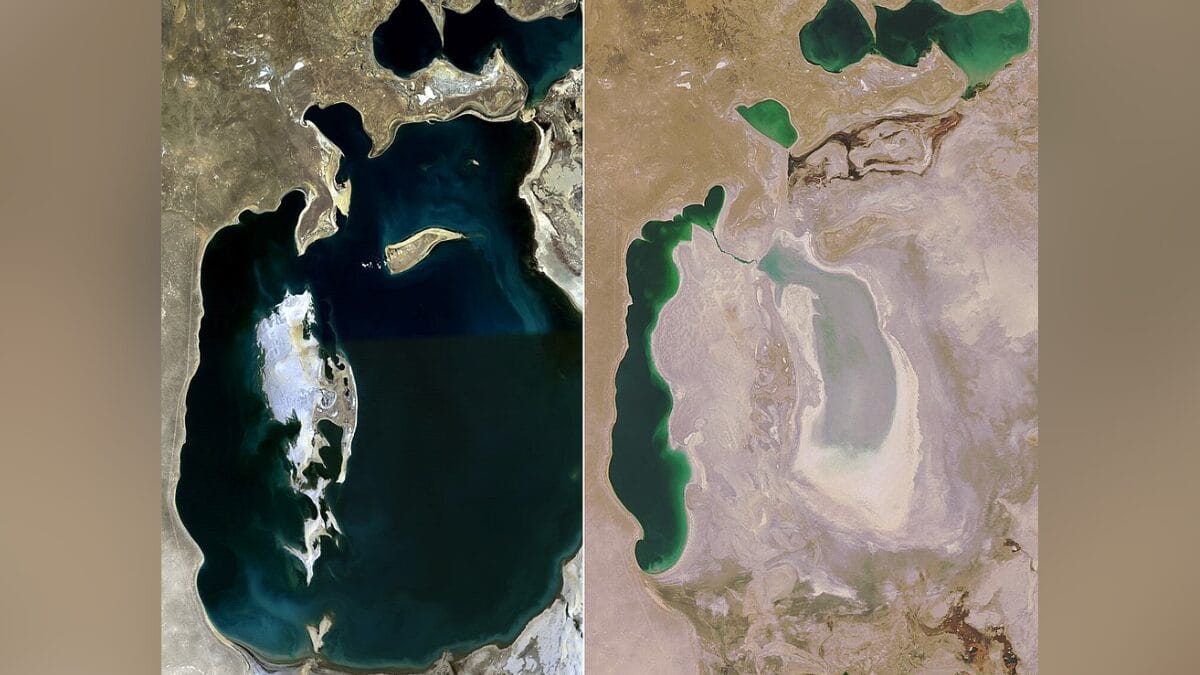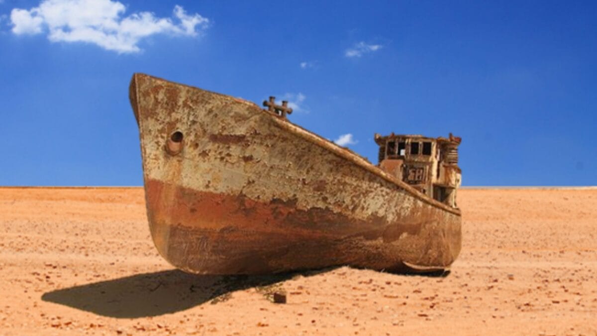 O Mar de Aral, na Ásia Central, era um lago salgado tão vasto que funcionava como um moderador do clima regional, mas se transformou em areia completa. Centenas de navios ficaram encalhados com a transformação da água em deserto. O caso é conhecido como uma das maiores tragédias ambientais causadas pelo homem em todo o planeta.