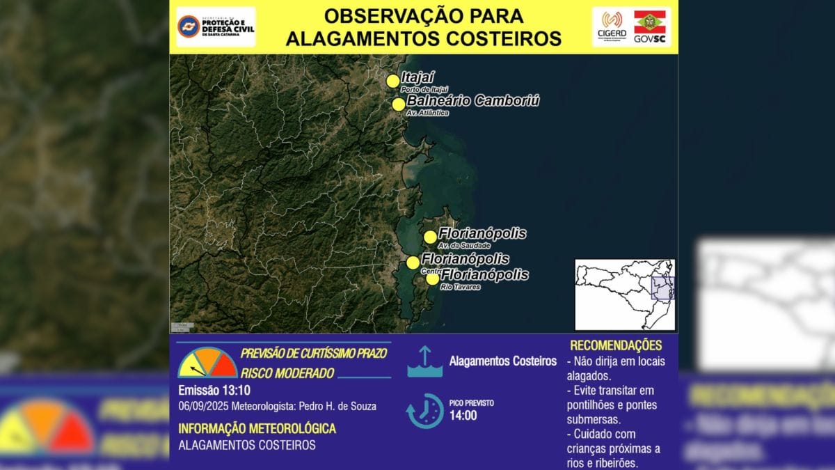 Os municípios de Balneário Camboriú, Florianópolis e Itajaí devem sofrer com alagamentos costeiros nas próximas horas deste sábado (6), segundo um alerta divulgado pela Defesa Civil.