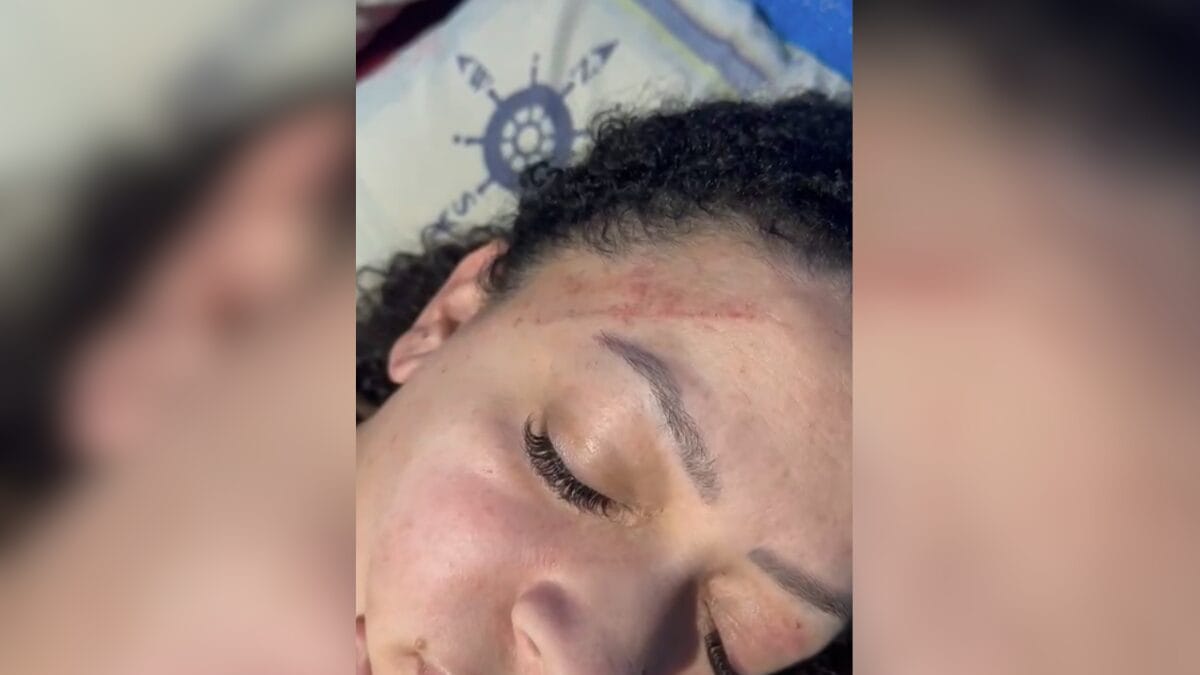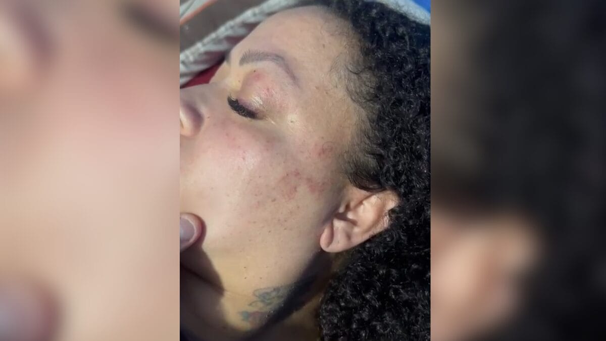 A mulher que aparece em vídeo levando um tapa no rosto durante uma ação da Polícia Militar (PM) no bairro Monte Cristo, em Florianópolis, e o marido dela ficaram com diversos hematomas após a abordagem ocorrida no último sábado (7). As imagens mostram a mulher já rendida no chão quando um dos policiais desfere o golpe.