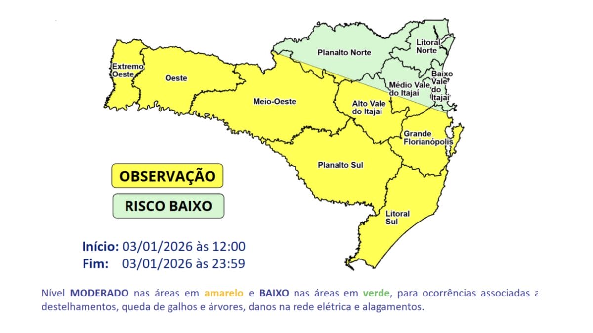 Para quem esperava que o primeiro fim de semana de 2026 em Santa Catarina seguisse a linha do início do ano, com temperaturas altas típicas de verão, se enganou. Isto porque mudanças estão previstas para os próximos dias, com chances de ventos de 80 km/h, ressaca e queda brusca nos termômetros, com previsão de mínimas de 4°C na região serrana.
