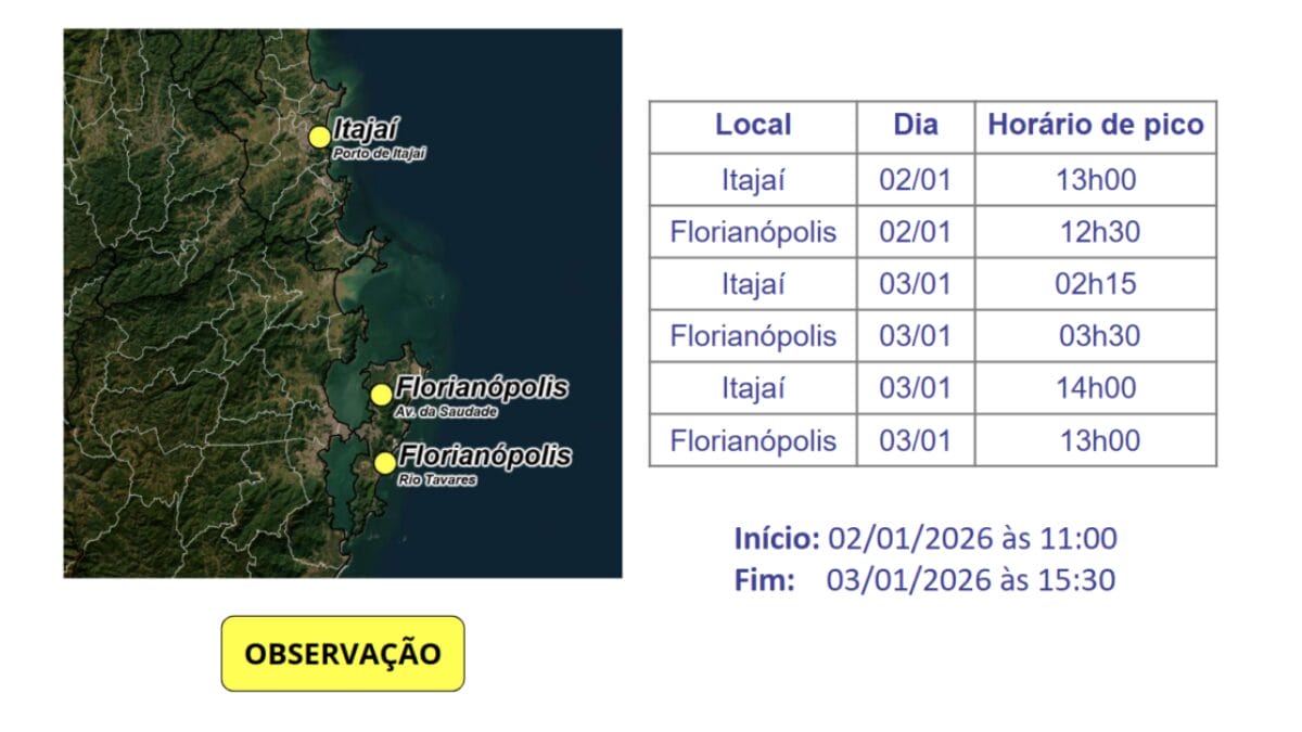 A Defesa Civil alerta que, por conta da ressaca, o risco é moderado para alagamentos costeiros no Litoral. Em Florianópolis, o pico da maré deve acontecer às 3h30min e 13h de sábado, enquanto em Itajaí a previsão é de que o pico seja registrado às 2h15min e às 14h, também no sábado.