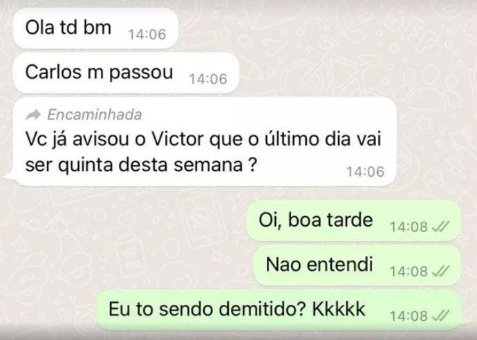 Victor conta que foi surpreendido com a mensagem. Até porque, segundo ele, o contrato exige aviso prévio de ao menos 30 dias de antecedência. O que não ocorreu neste caso.