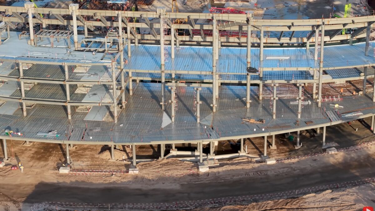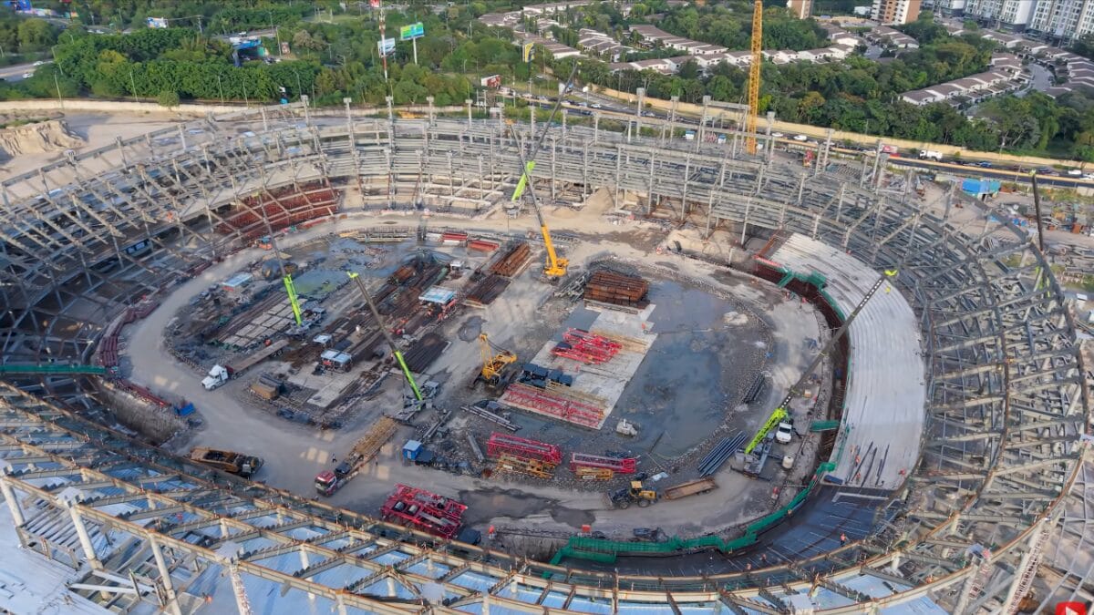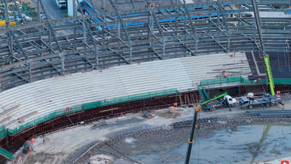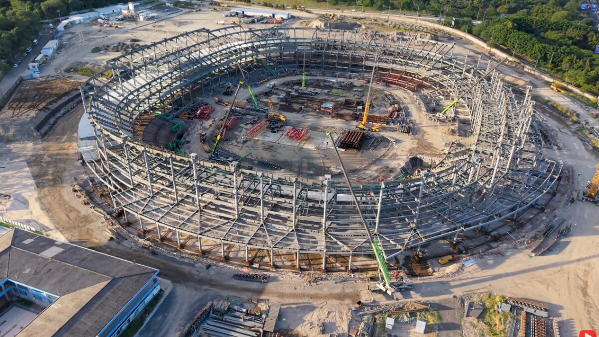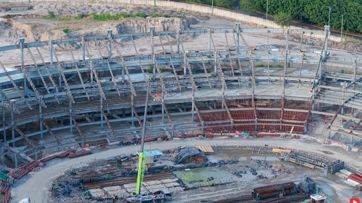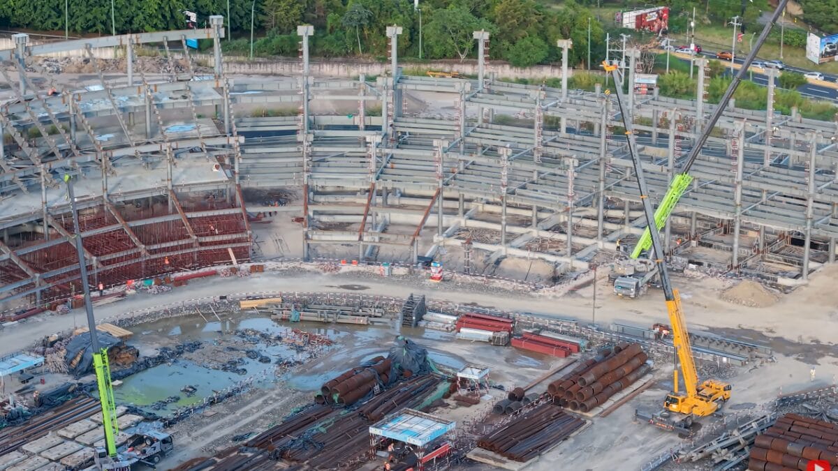 Nos últimos dias, a obra entrou em uma das etapas mais decisivas. Com o fechamento completo do anel estrutural que sustentará as arquibancadas superiores, a prioridade de construção passará a ser do interior do recinto.