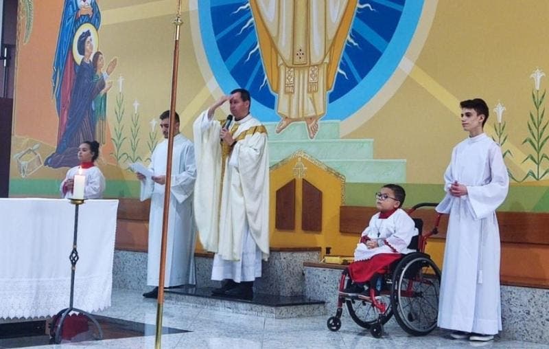 Quando tinha um ano e sete meses, Lucas da Silva, que hoje tem sete anos, foi diagnosticado com Atrofia Medular Espinhal (AME), e a doença fez com que ele tivesse alguns dos movimentos limitados. Mas, o morador de Joinville cultivou um sonho que também tem a ver com fé: ele desejava ser coroinha.