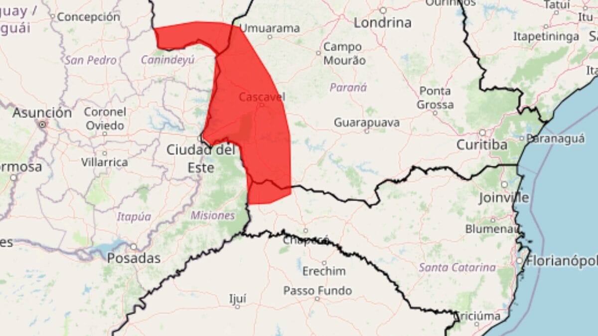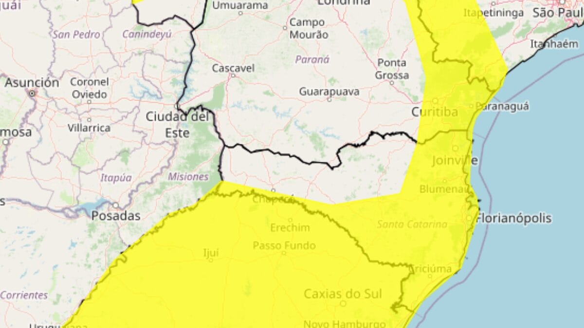 Além do aviso para atenção meteorológica emitido pela Defesa Civil, o Instituto Nacional de Meteorologia (Inmet) também colocou Santa Catarina, Paraná e Mato Grosso do Sul em alerta vermelho de grande perigo para tempestades, que podem causar chuvas com volumes maiores que 100 milímetros por dia na sexta-feira (12), com ventos superiores a 100 km/h e queda de granizo.