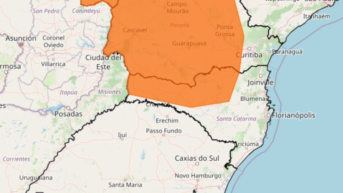 Em relação a este alerta, o Extremo Oeste deve ser a região mais afetada, segundo a previsão do Inmet. Também há um alerta laranja, com chuva volumosa de 50 a 100 milímetros por dia desde o Oeste até os Planaltos, que inicia já na noite desta quinta-feira (11). Da mesma forma, no Litoral, Sul, Norte, e Serra, o alerta é amarelo, com perigo potencial para chuva de até 50 milímetros e ventos de até 60 km/h.