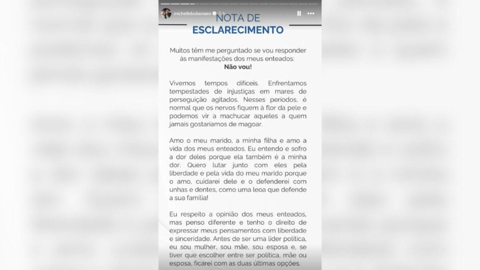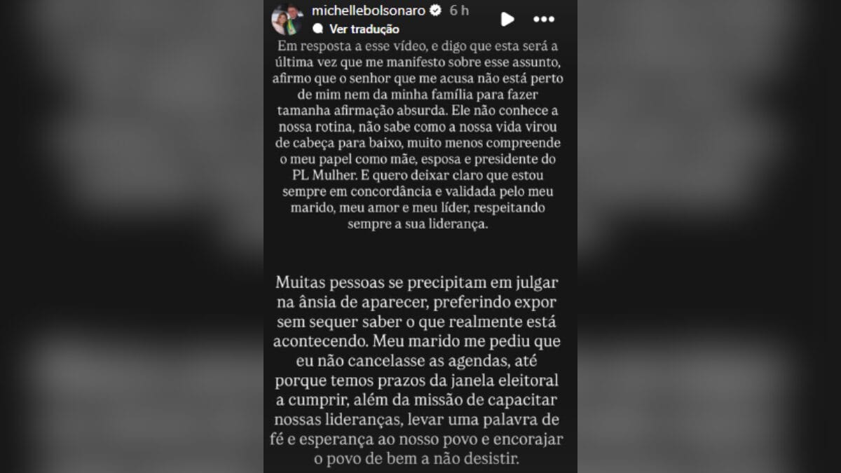 “Ele não conhece a nossa rotina, não sabe como a nossa vida virou de cabeça para baixo, muito menos compreende o meu papel como mãe, esposa e presidente do PL Mulher. E quero deixar claro que estou sempre em concordância e validada pelo meu marido, meu amor e meu líder, respeitando sempre a sua liderança”, escreveu Michelle.