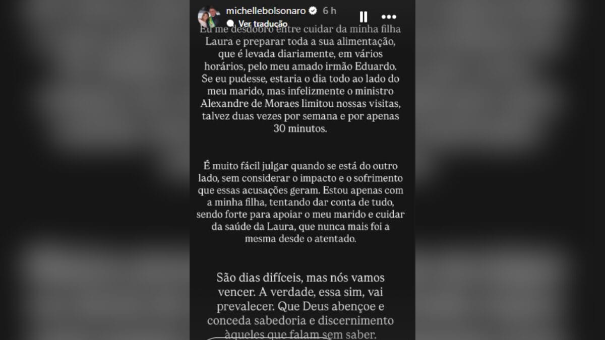 “Eu me desdobro entre cuidar da minha filha Laura e preparar toda a sua alimentação, que é levada diariamente, em vários horários, pelo meu amado irmão Eduardo. Se eu pudesse, estaria o dia todo ao lado do meu marido, mas infelizmente o ministro Alexandre de Moraes limitou nossas visitas, talvez duas vezes por semana e por apenas 30 minutos”, escreveu.