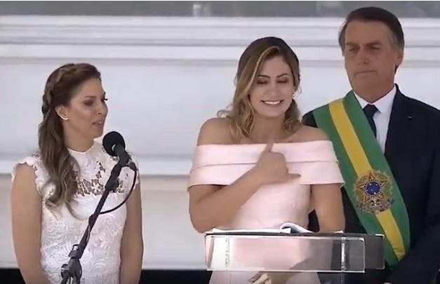 A primeira-dama Michelle Bolsonaro surpreendeu e quebrou o protocolo ao discursar em libras na posse presidencial. Ela trocou de lugar com a intérprete, a quem coube dar voz ao que dizia, com as mãos, a mulher de Jair Bolsonaro.