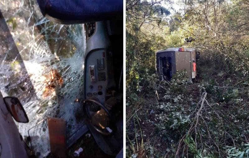 Imagens mostram o veículo caído na posição em que parou após capotar. O micro-ônibus caiu no meio da mata, os vidros de trás aparecem quebrados e o da frente trincado, com marcas de sangue.