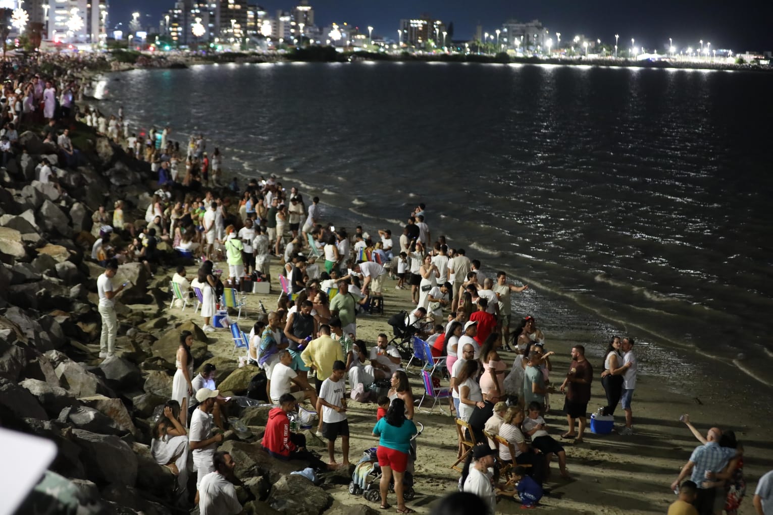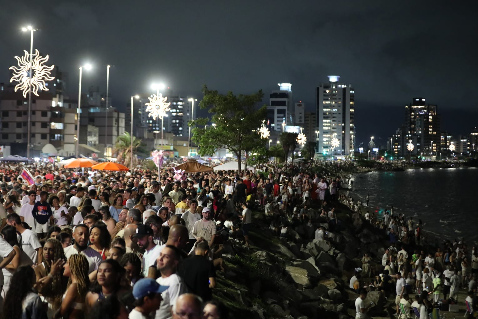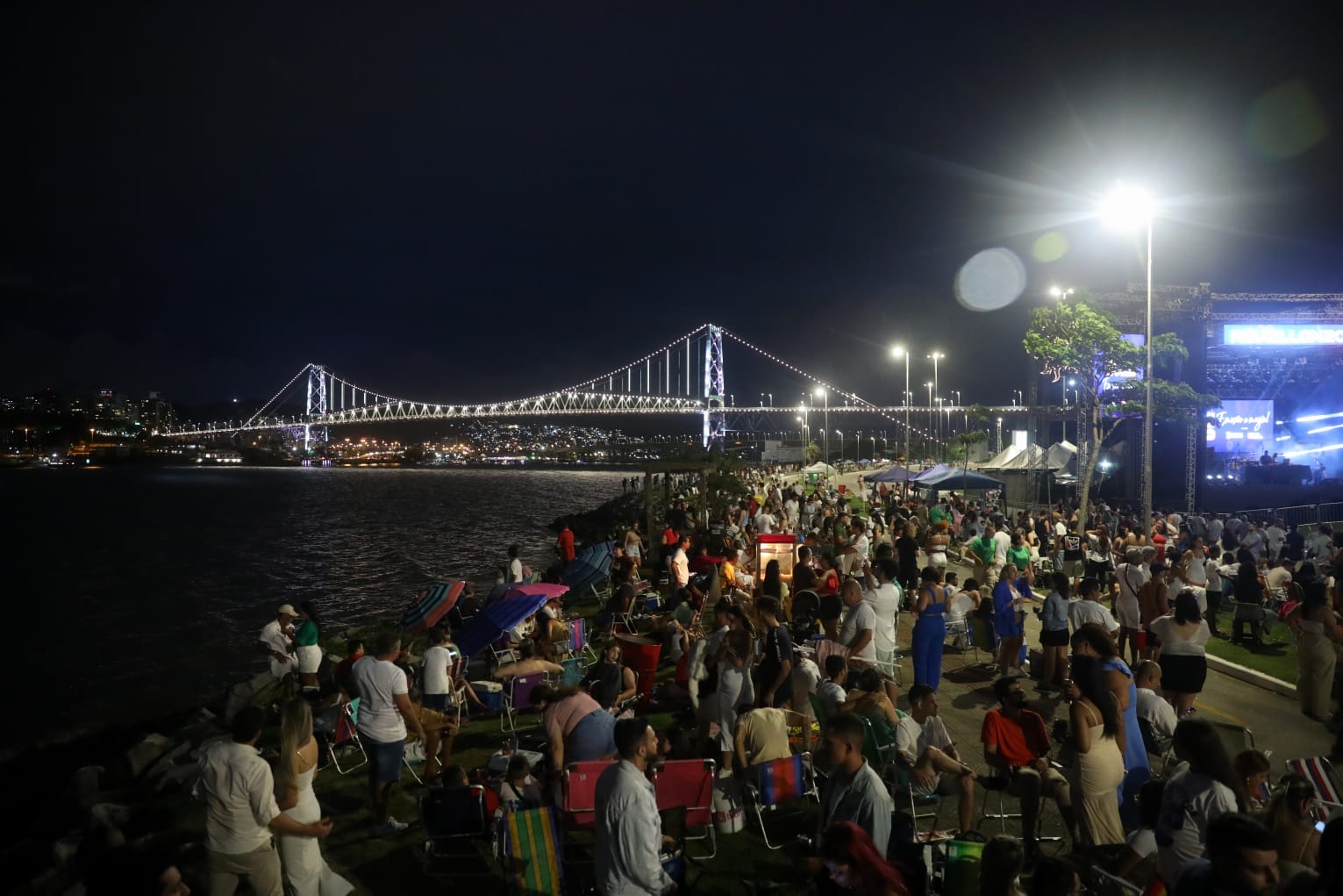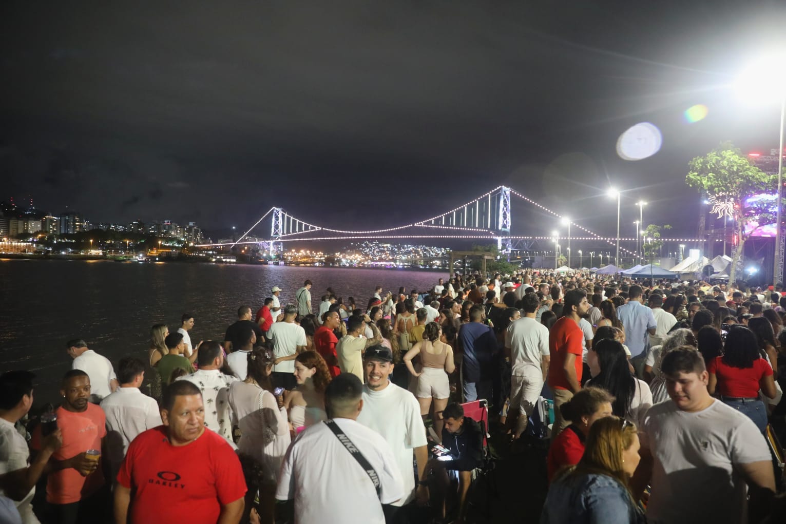 Quem pretende entrar em 2025 enquanto admira o show de fogos de artifício na Beira-Mar Norte, em Florianópolis, garantiu o seu lugar cedo. Por volta das 21h, uma multidão já aguardava a chegada do Réveillon ao longo da avenida, e também na Beira-Mar Continental, que terá vista privilegiada para a cascata na Ponte Hercílio Luz.