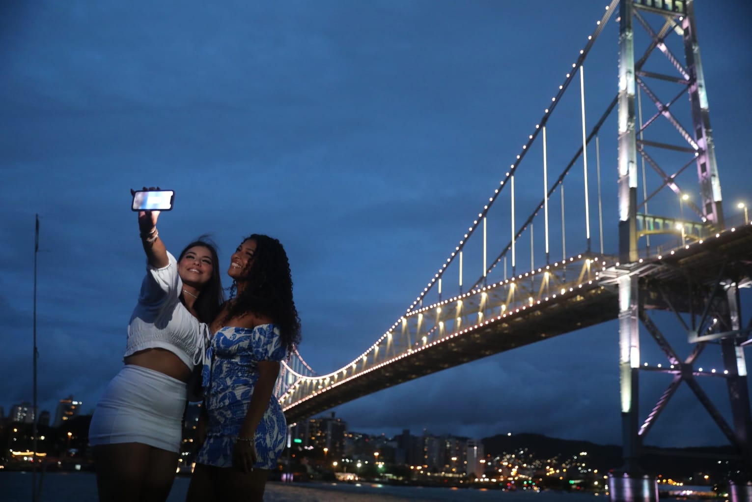 A estrutura preparada para o Réveillon na capital catarinense conta com quatro balsas ao longo da Beira-Mar Norte, além da tradicional cascata de luzes na Ponte Hercílio Luz.
