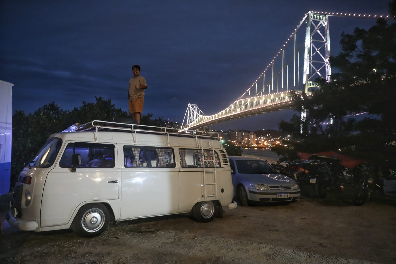 Ela é dona da kombi, que conta com estrutura completa, como uma “casa”. Raquel relata que costuma participar de eventos e passeios com a kombi, e que a programação de fogos, com a Ponte Hercílio Luz de fundo, foi o que fez o grupo decidir pelo destino de Réveillon. A preparação para a virada começou cedo.