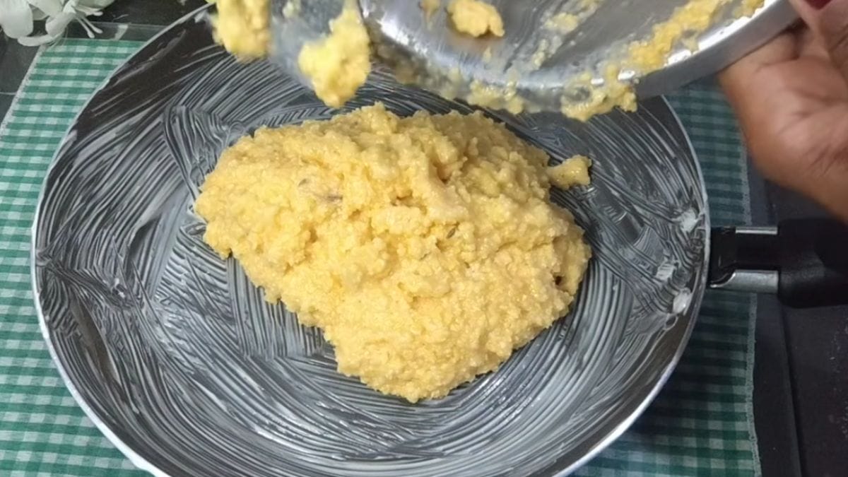 Agora, coloque um ovo, o açúcar, o sal e o óleo em um recipiente e misture novamente até dissolver o açúcar. Acrescente a mistura de flocão de milho no recipiente e mexa.