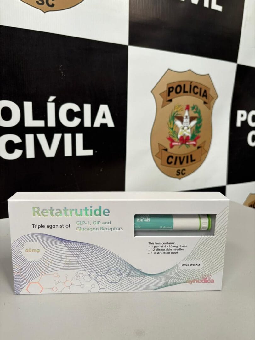 O medicamento é conhecido como Retatrutide, um injetável usado para o tratamento da obesidade. Uma dessas canetas emagrecedoras, que tinha sido colocada à venda na internet, foi apreendida pelos policiais na residência do suspeito no bairro Gasparinho nesta sexta-feira (6). Ele divulgava os produtos nas redes sociais como de “pronta-entrega” e incentivava a compra com imagens de supostos clientes que teriam perdido mais de 10 quilos em 30 dias.