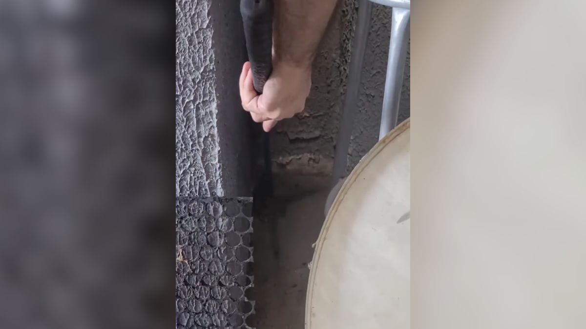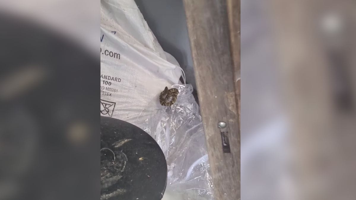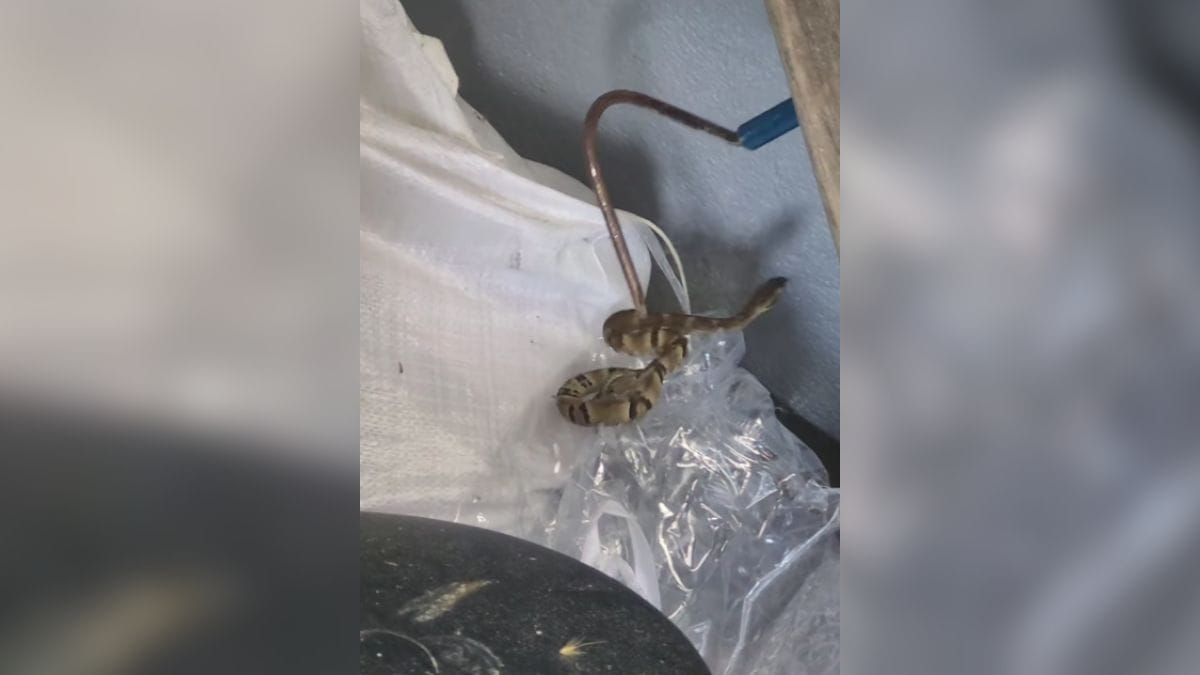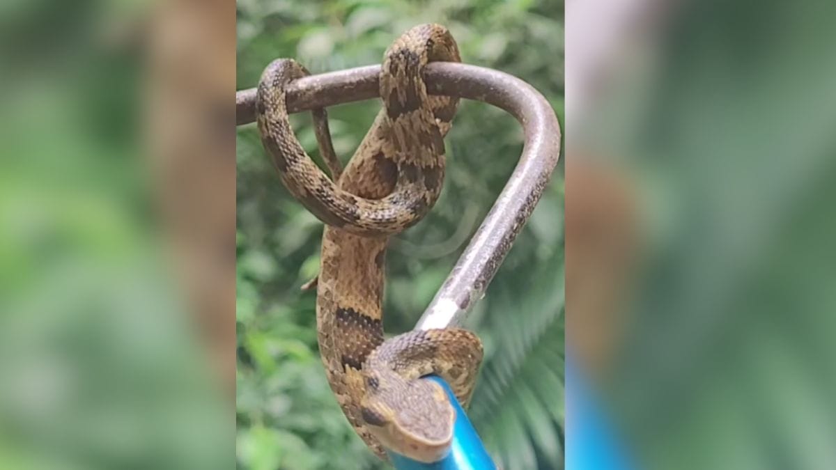 Giba, como o biólogo é conhecido, ainda mostrou as tentativas de resgatar o bicho peçonhento, que estava enrolado próximo à churrasqueira e bicicleta do morador que foi surpreendido.