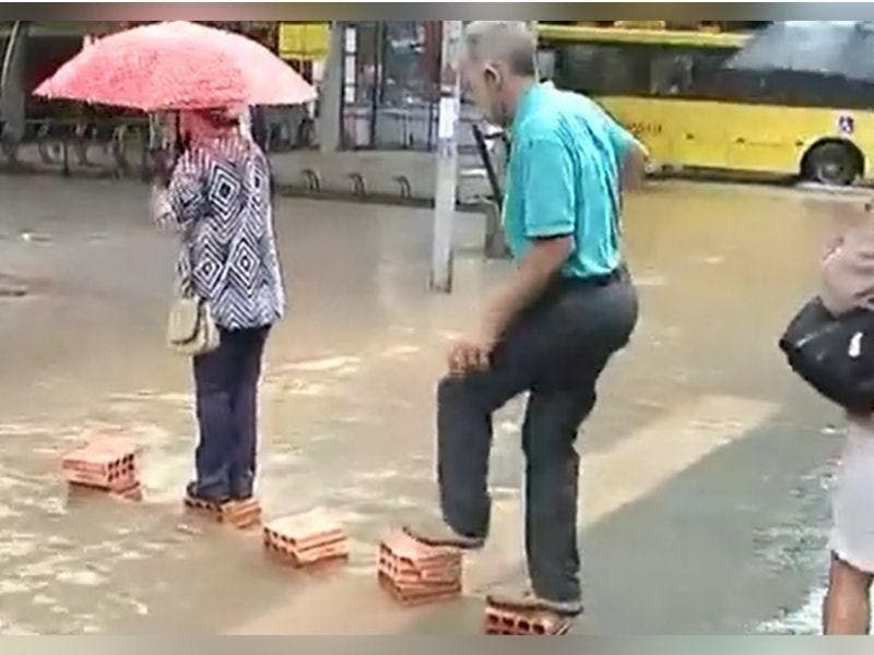 Para se livrar da água da chuva, moradores de Joinville montaram uma espécie de “ponte de tijolos” para atravessar a faixa de pedestres no Centro da cidade. A cena foi registrada na manhã de segunda-feira (1°) durante uma reportagem da NSC TV e as imagens viralizaram após uma página de humor compartilhar o vídeo.