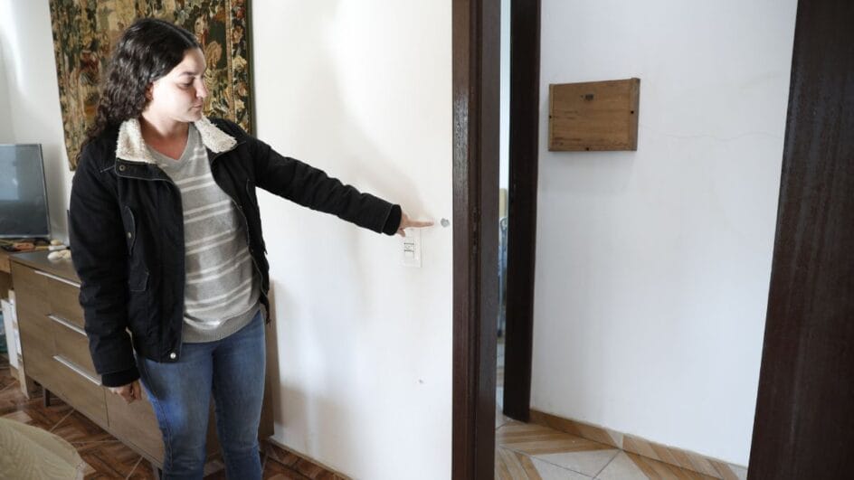 Com lágrimas pelo rosto, Mariana mostra o local onde o pai foi morto com quatro tiros, dentro de casa, além da marca da bala que ficou alojada na parede. A família não tinha voltado para o imóvel até então.