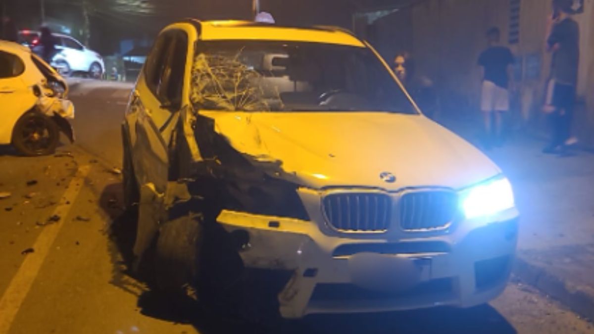 Depois de bater contra o piloto, o motorista da BMW entrou na Rua Afonso Moreira, e colidiu na traseira de um veículo estacionado e causou uma espécie de engavetamento com outros dois carros estacionados.