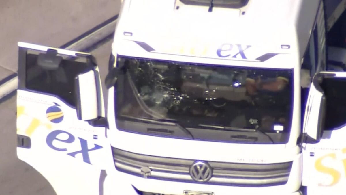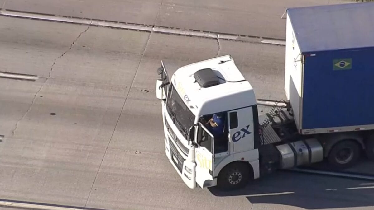 O motorista permanece imóvel, de braços cruzados, dentro da cabine da carreta. O vidro do para-brisa do veículo está quebrado.