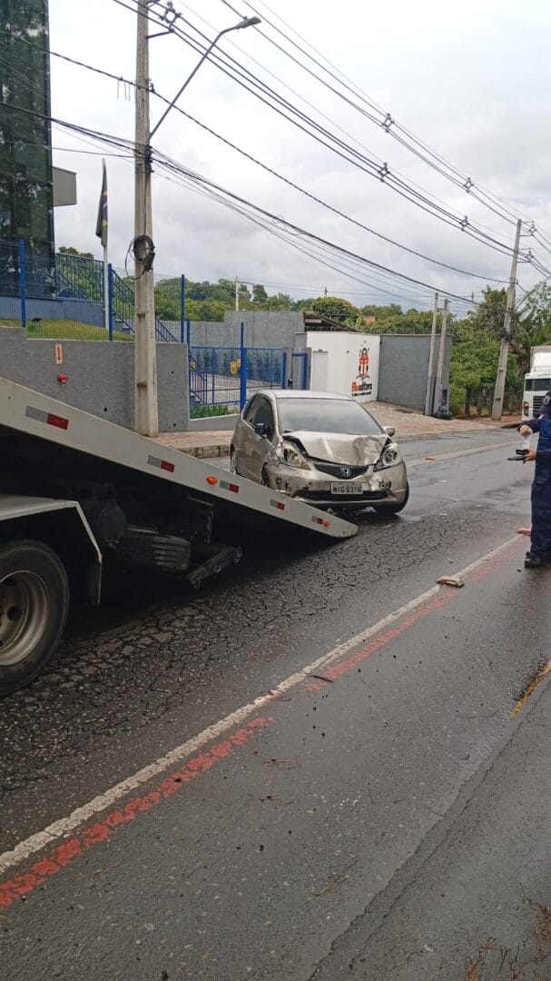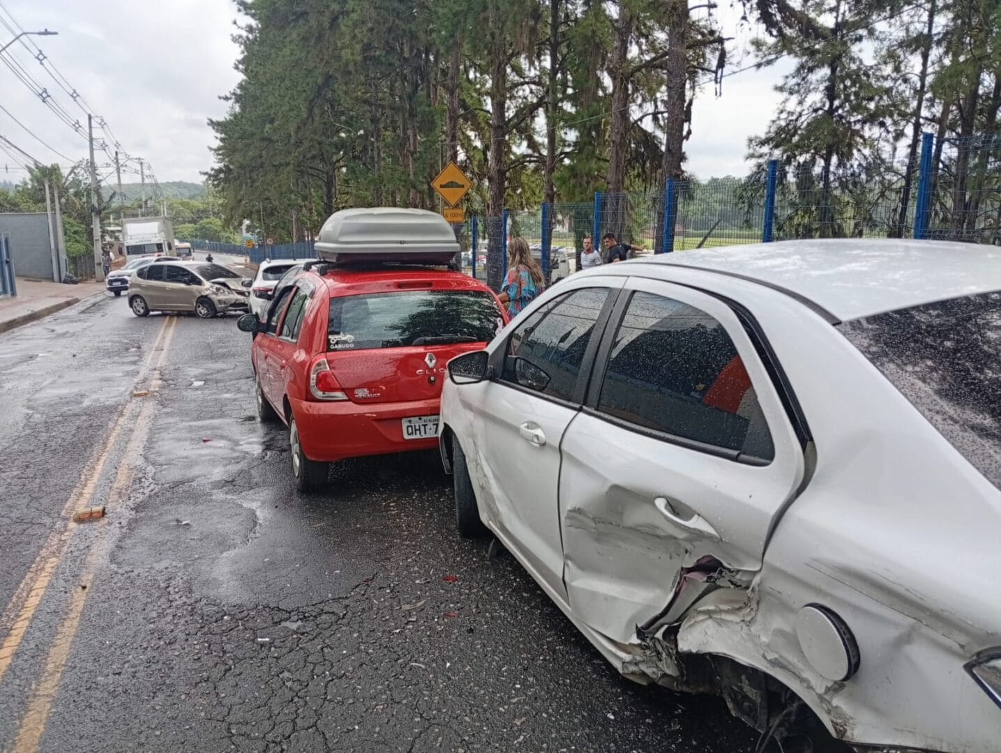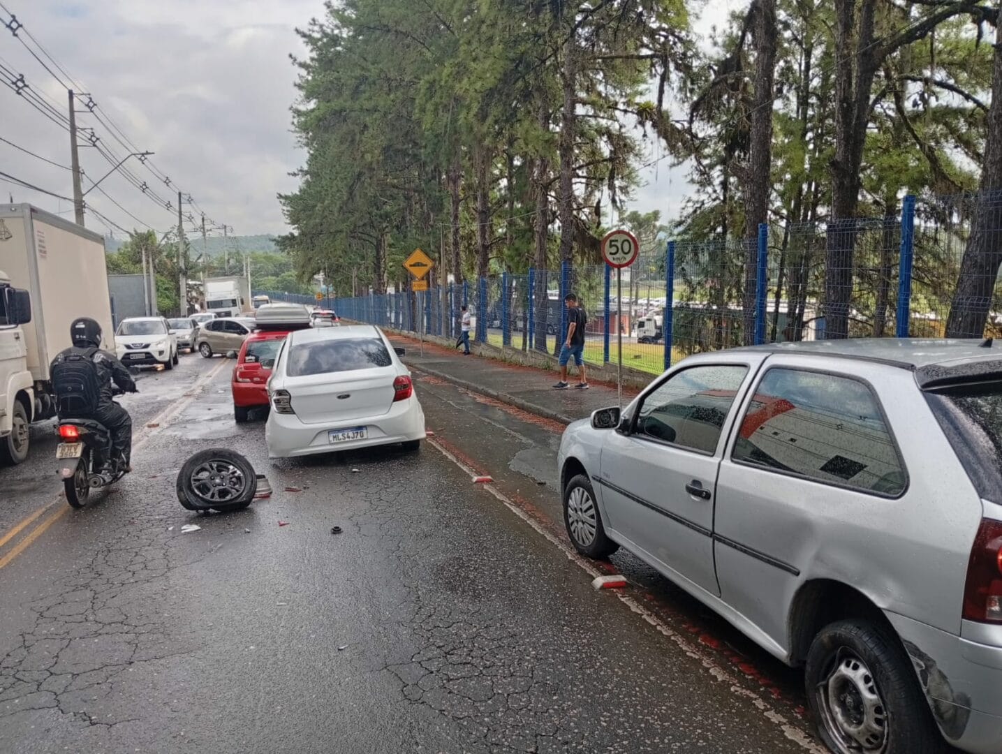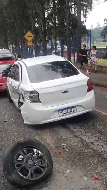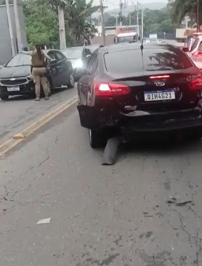 O condutor perde o controle da direção, bate na traseira do último veículo, desvia levemente para o lado e continua a dirigir rapidamente, colidindo com a lateral dos demais carros na fileira até rodopiar e parar na pista. Ao ver a viatura policial se aproximar, o homem sai do veículo e tenta fugir a pé.