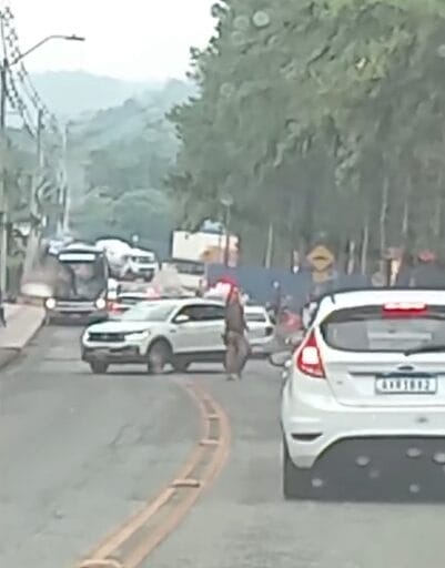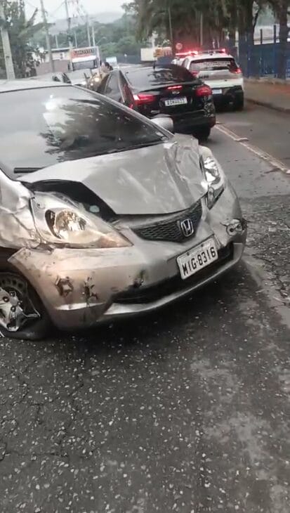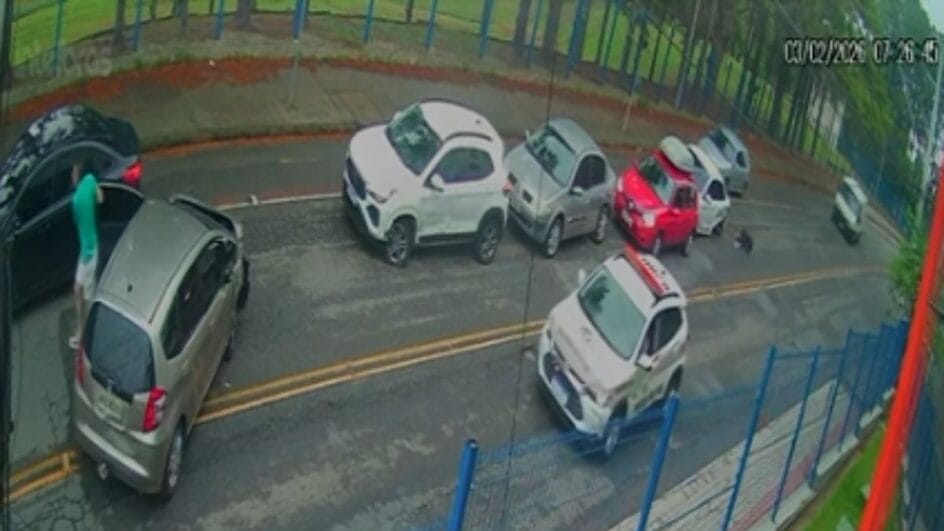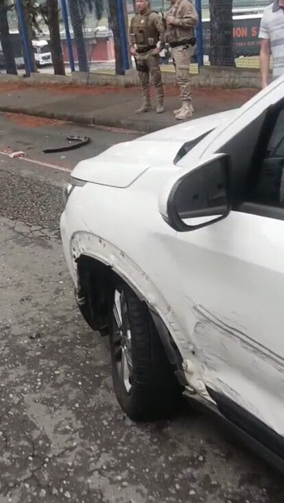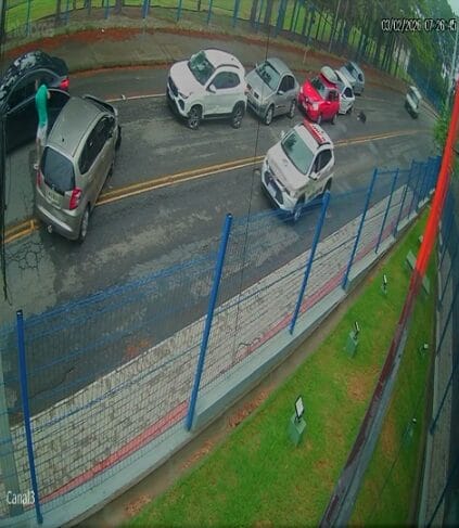 A Polícia Militar foi acionada para uma ocorrência de violência doméstica, mas, ao chegar no local, o suspeito entrou em um carro e fugiu da abordagem. As imagens de câmeras de segurança da região mostram quando, em uma fila de veículos parados na sinaleira, um Honda Fit cinza se aproxima em alta velocidade.