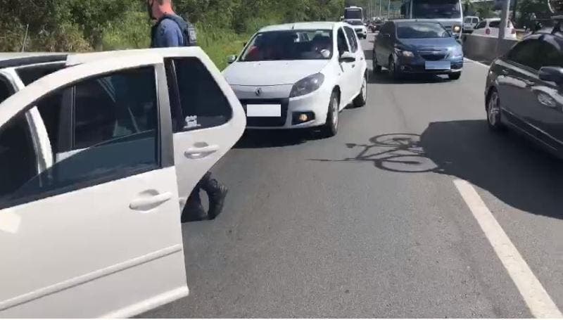 A ocorrência foi registrada no sentido Centro da rodovia, na subida do cemitério Jardim da Paz. Ainda conforme a Guarda, o veículo tinha placas de São José. A Polícia Militar Rodoviária (PMRv) também atendeu a ocorrência. Os carros atingidos foram deslocados para o acostamento, mas houve impacto ao trânsito. Até as 9h30, havia retenção de fluxo neste trecho da rodovia.