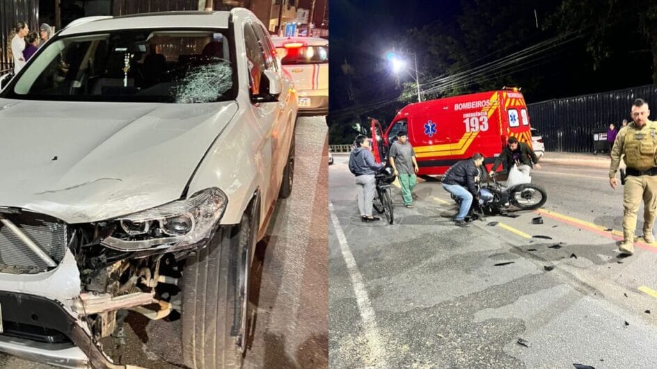 O motorista de uma BMW foi detido bêbado após causar um acidente e agredir policiais em Balneário Camboriú, na noite de sexta-feira (30). Segundo a Polícia Militar (PM), ele dirigia em alta velocidade na contramão na Rua Emanuel Rebelo dos Santos, no bairro Barra, quando bateu de frente com uma moto. O motociclista quebrou um braço e foi encaminhado a uma unidade de saúde.