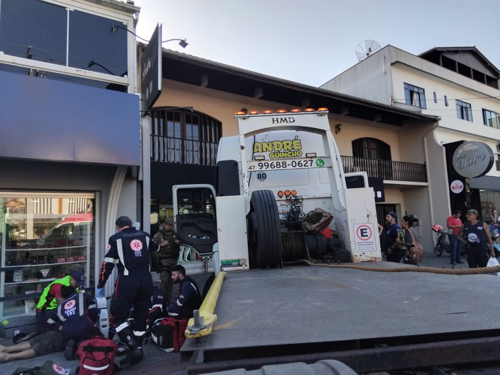 O acidente ocorreu na Rua Amazonas, perto da entrada para a Rua Antônio Zendron, no bairro Garcia. O caminhão guincho bateu contra a lateral de um ônibus onde estavam 40 pessoas e parou em cima da calçada. Apesar do susto, nenhum passageiro ou pedestre se feriu.