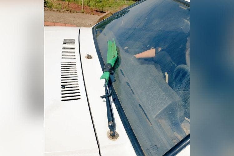O rodo estava fixado no para-brisa dianteiro do veículo. O motorista, porém, não informou porque estava usando o objeto como limpador. A polícia também percebeu, durante a abordagem, problemas no pneu e que o carro não tinha licença.