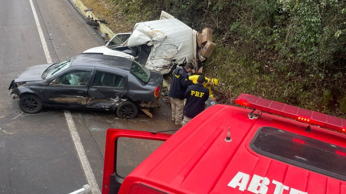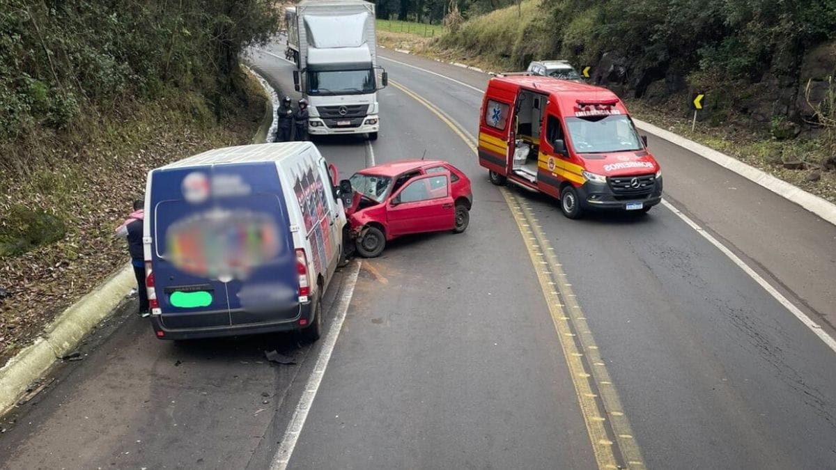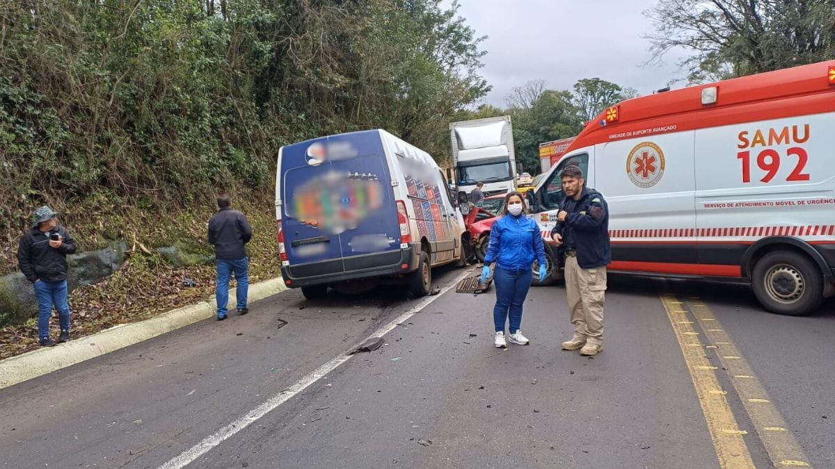 Um grave acidente de trânsito foi registrado por volta das 11h20 desta sexta-feira (08), na BR-282, entre os municípios de Xaxim e Cordilheira Alta, no Oeste de Santa Catarina. A colisão envolveu quatro veículos, sendo um Renault Clio, uma Van Master, um Volkswagen Gol e um Fiat Fiorino. A ocorrência foi atendida por equipes do Corpo de Bombeiros e SAMU.