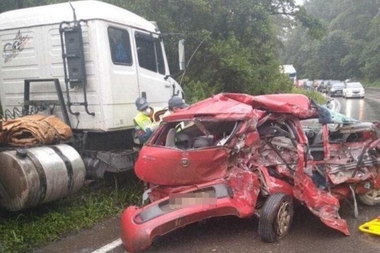 Ainda conforme a PMRv, o acidente aconteceu quando o motorista do carro perdeu o controle da direção em uma curva, sentido Campo Alegre a Joinviile, e invadiu a pista contrária, colidindo com o caminhão. O motorista da carreta teria pisado no freio e, com a colisão, também perdido o controle da direção e arrastado o carro por 30 metros. Os dois veículos colidiram, ainda, com uma motocicleta. O piloto se jogou na rodovia para se salvar, enquanto a moto foi arrastada por carreta e carro.
