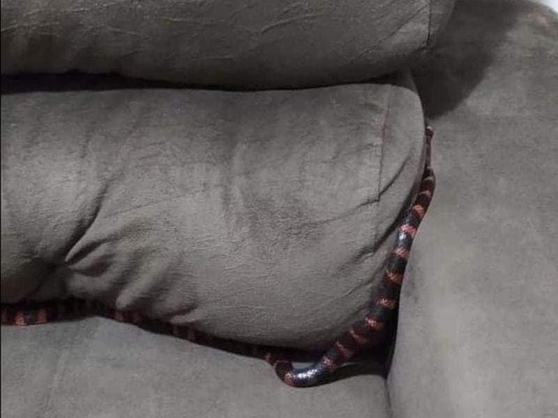 Uma mulher de 30 anos pegou no sono enquanto estava na sala de estar de sua casa, em Jaraguá do Sul, e foi acordada no susto com uma cobra subindo no pé durante a madrugada de segunda-feira (22). A serpente, uma falsa-coral de 20 centímetros, já estava dentro do sofá quando foi resgatada pelos bombeiros.