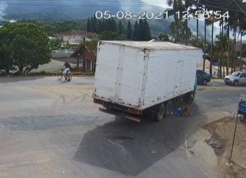 Como é possível observar nas imagens, o motorista saía da Rua Alberto Muller e virou à direita para seguir sentido Itajaí quando ocorreu a batida. Ele disse à PM não ter visto a ciclista, que atingiu a lateral direita do veículo e foi parar embaixo do caminhão. No momento do acidente, por volta das 14h, o movimento era intenso na estrada. O passageiro percebeu a presença da vítima no chão e desceu para prestar socorro. Logo veio o motorista com as mãos na cabeça, assustado.