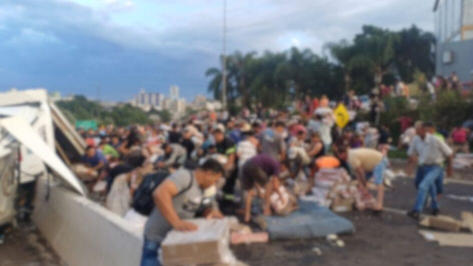 Uma multidão carregou em poucos minutos milhares de quilos de carne que caíram na BR-282, em Xanxerê, na tarde desta sexta-feira (27). A carreta que transportava a mercadoria tombou na rodovia e a carga acabou se espalhando no meio das pistas. Não demorou até dezenas de pessoas começarem a pegar as caixas de congelados e levar para os próprios carros.