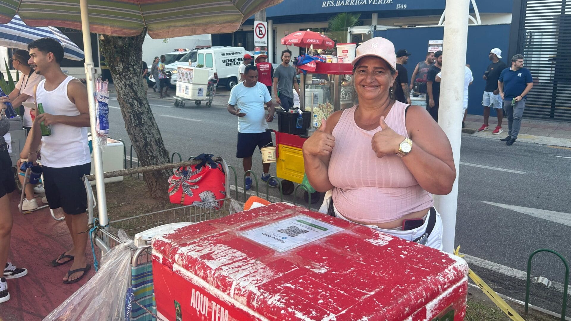 A energia de “pontapé” na folia não é sentida somente para quem vem para curtir. A vendedora ambulante Rosane Maria Rodrigues, de 55 anos, trabalha há 18 anos em meio à festa com muito bom-humor.