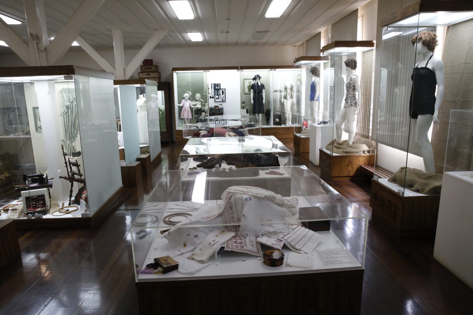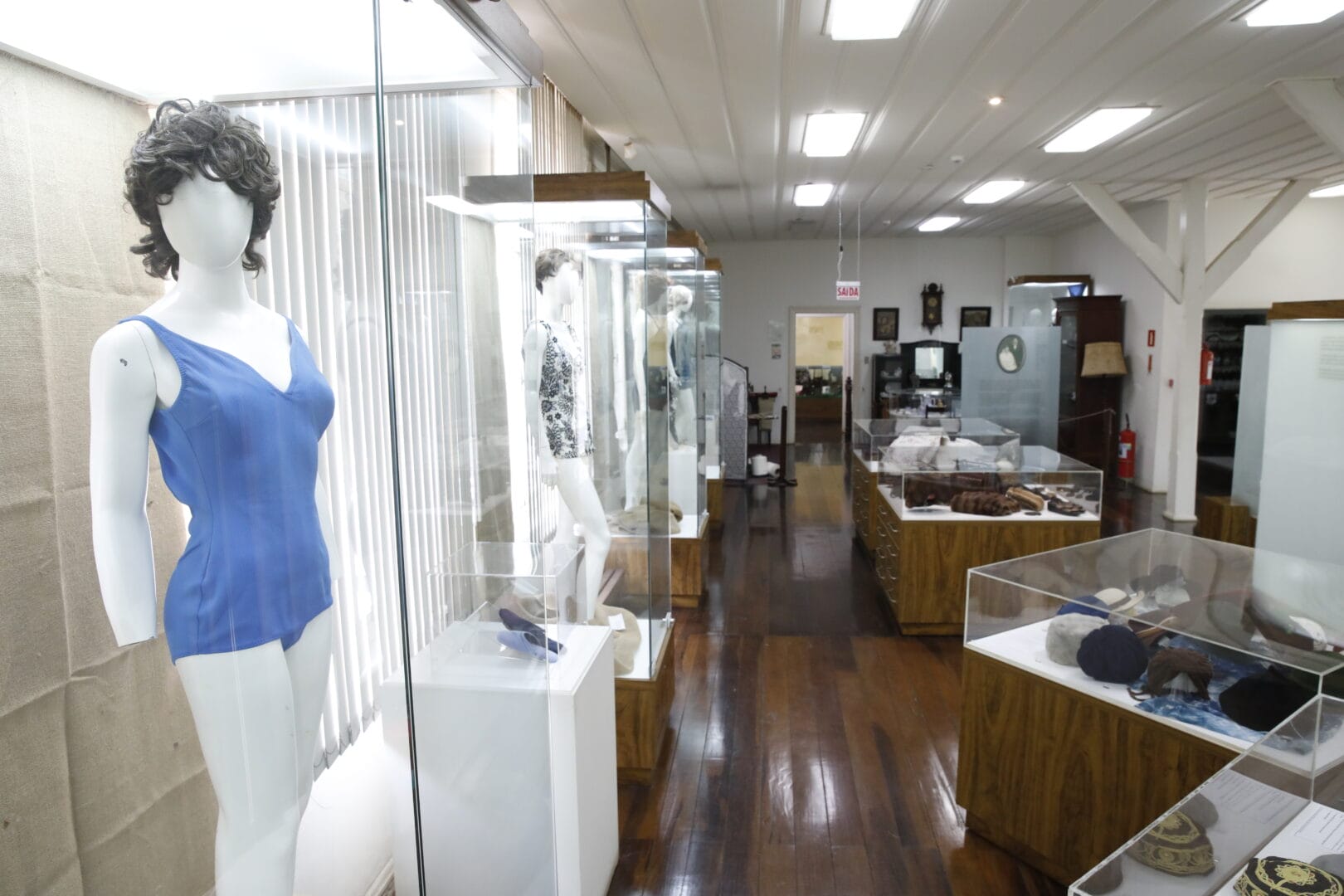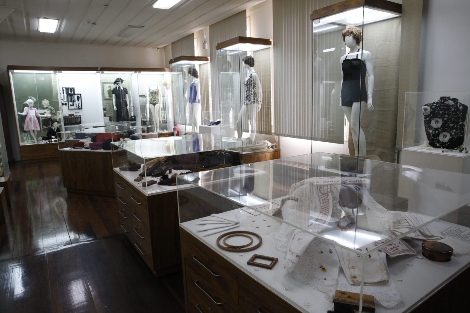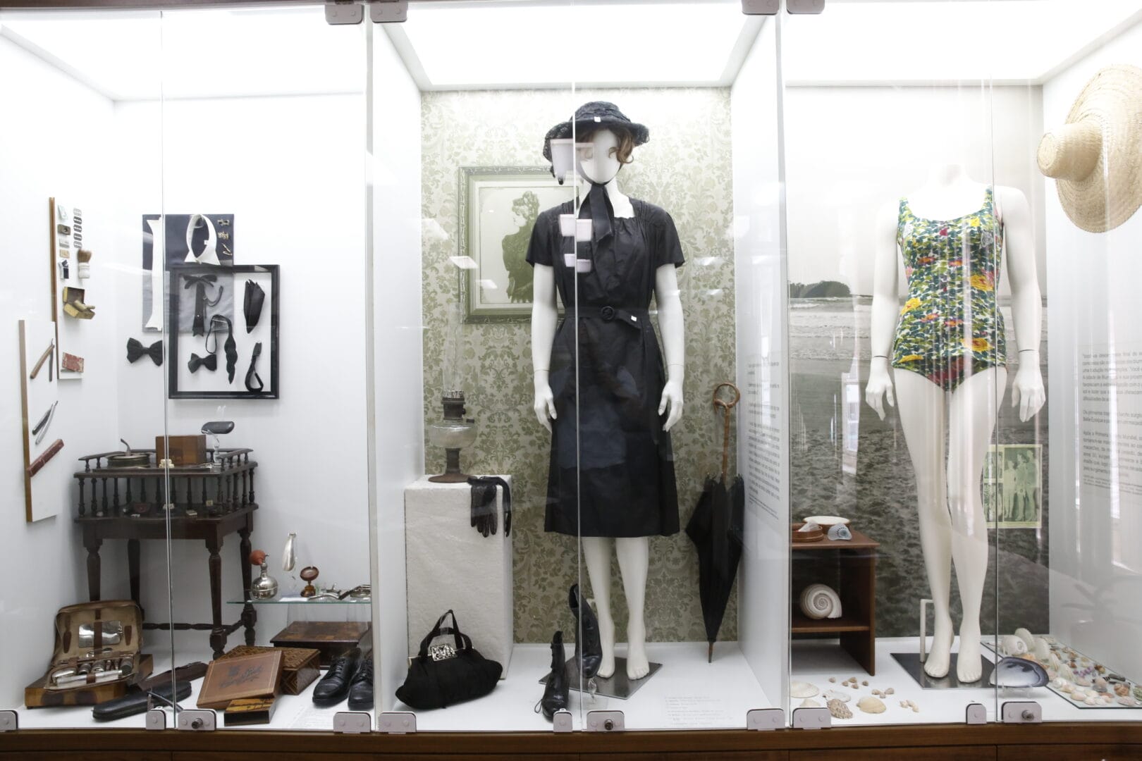 A moda, que atravessa o acervo de ponta a ponta, não é tratada como frivolidade. Os trajes de banho, por exemplo, contam como Blumenau sempre teve uma relação intensa com o litoral. “Você vai descer neste final de semana?”, perguntavam os blumenauenses, e qualquer um sabia que “descer” era ir à praia. Os primeiros trajes de banho, da Belle Époque, pareciam macacões inteiros. Depois da Primeira Guerra Mundial, foram ficando mais aderentes ao corpo, feitos de material pesado como malha e lã. Nos anos 1930 surgiram os primeiros maiôs comportados, logo ameaçados, na década seguinte, pelo biquíni.