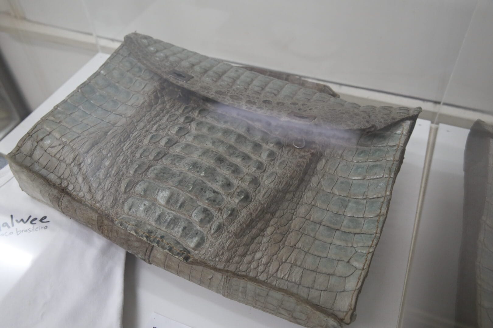 Quando o réptil morreu, o pai da doadora e arquiteto renomado da região, teria aproveitado a pele do animal para fazer a maleta. A filha, mais tarde, a usou como bolsa escolar, como contam as placas informativas na exposição.