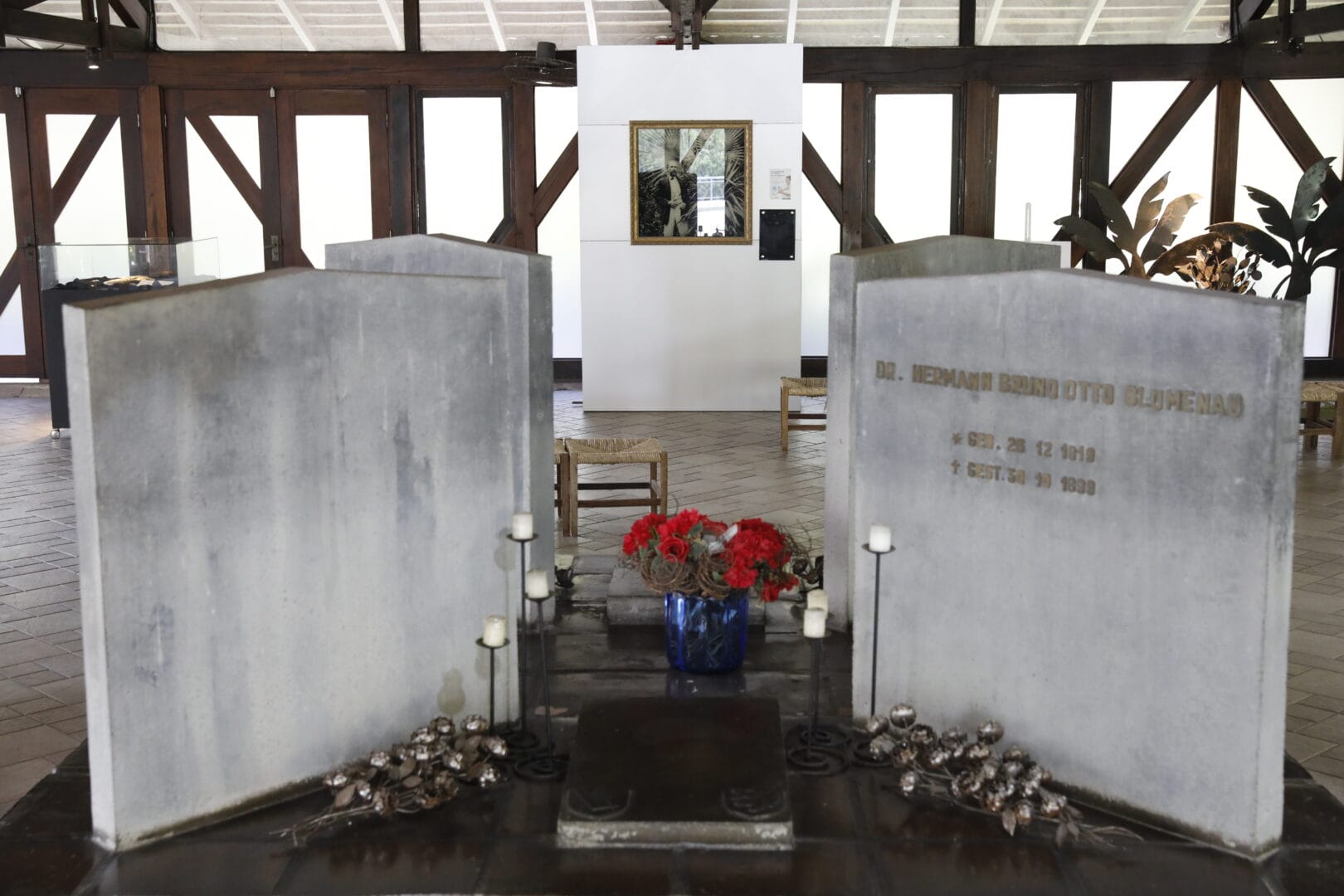 O espaço guarda os restos mortais de Hermann Bruno Otto Blumenau, o fundador da colônia que deu origem à cidade, e de outros membros da família. Ele morreu na Alemanha e foi sepultado em Braunschweig, em 30 de outubro de 1899. Em 2 de setembro de 1974, 75 anos da morte, os restos mortais retornam para Blumenau, que repousam junto aos familiares.