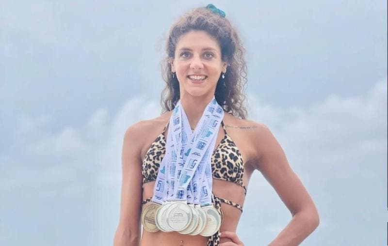 A italiana Linda Cerruti, do nado artístico, exibiu as oito medalhas (seis de prata e duas de bronze) que conquistou no Campeonato Europeu de Esportes Aquáticos, realizado neste mês em Roma. Ela posou de cabeça para baixo, com as medalhas penduradas nas pernas. Por causa da imagem, a nadadora foi alvo de comentários sexistas.