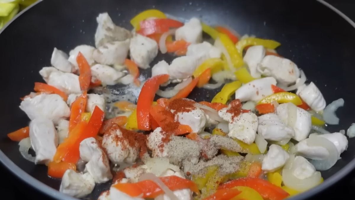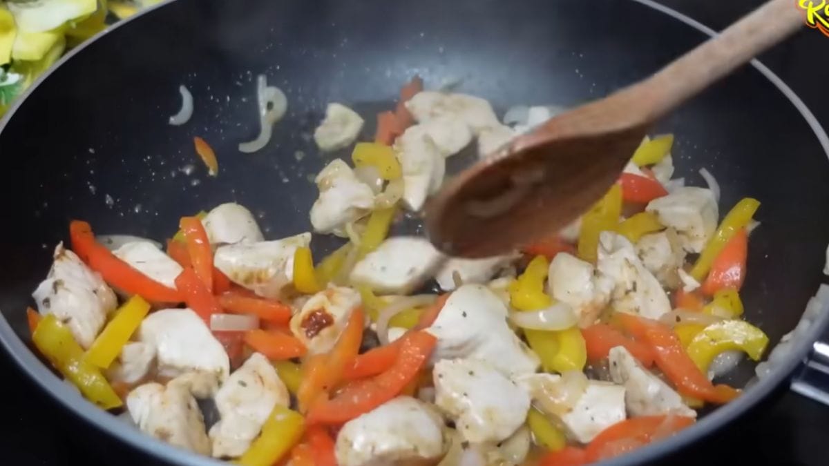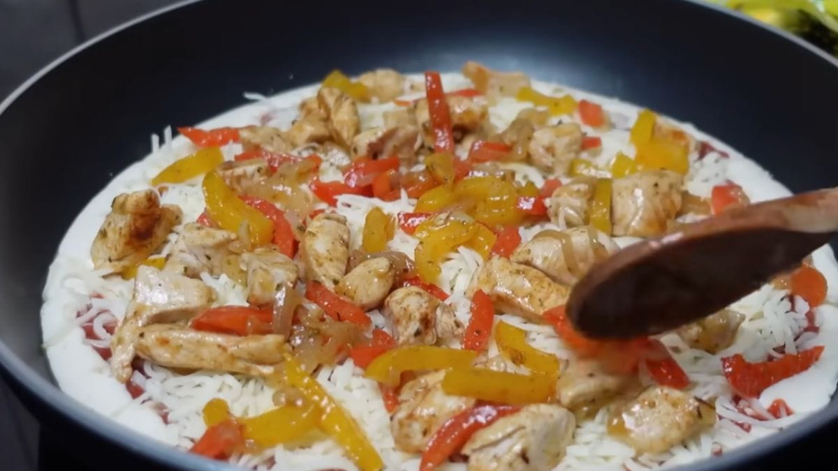 Unte uma frigideira com óleo e farinha e coloque a massa. Deixe por 20 minutos. Faça o recheio da sua preferência. A sugestão aqui é aproveitar temperos fortes como páprica e orégano e mistura com alimentos leves, como o frango.