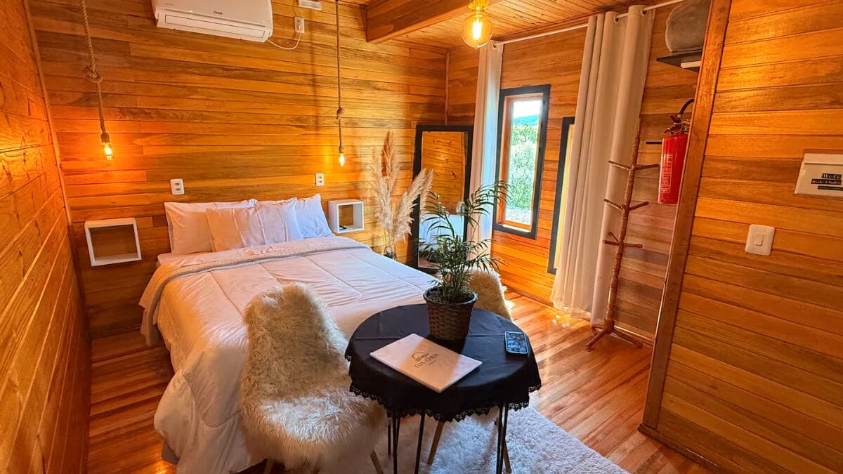 Voltada para casais, a cabana em São Ludgero, no Sul catarinense, fica localizada em meio à natureza. O local é equipado com uma cozinha totalmente equipada, um banheiro, um quarto com cama queen size, ar-condicionado, Smart TV e um varandão com uma vista surpreendente. A hospedagem também conta com hidromassagem.
